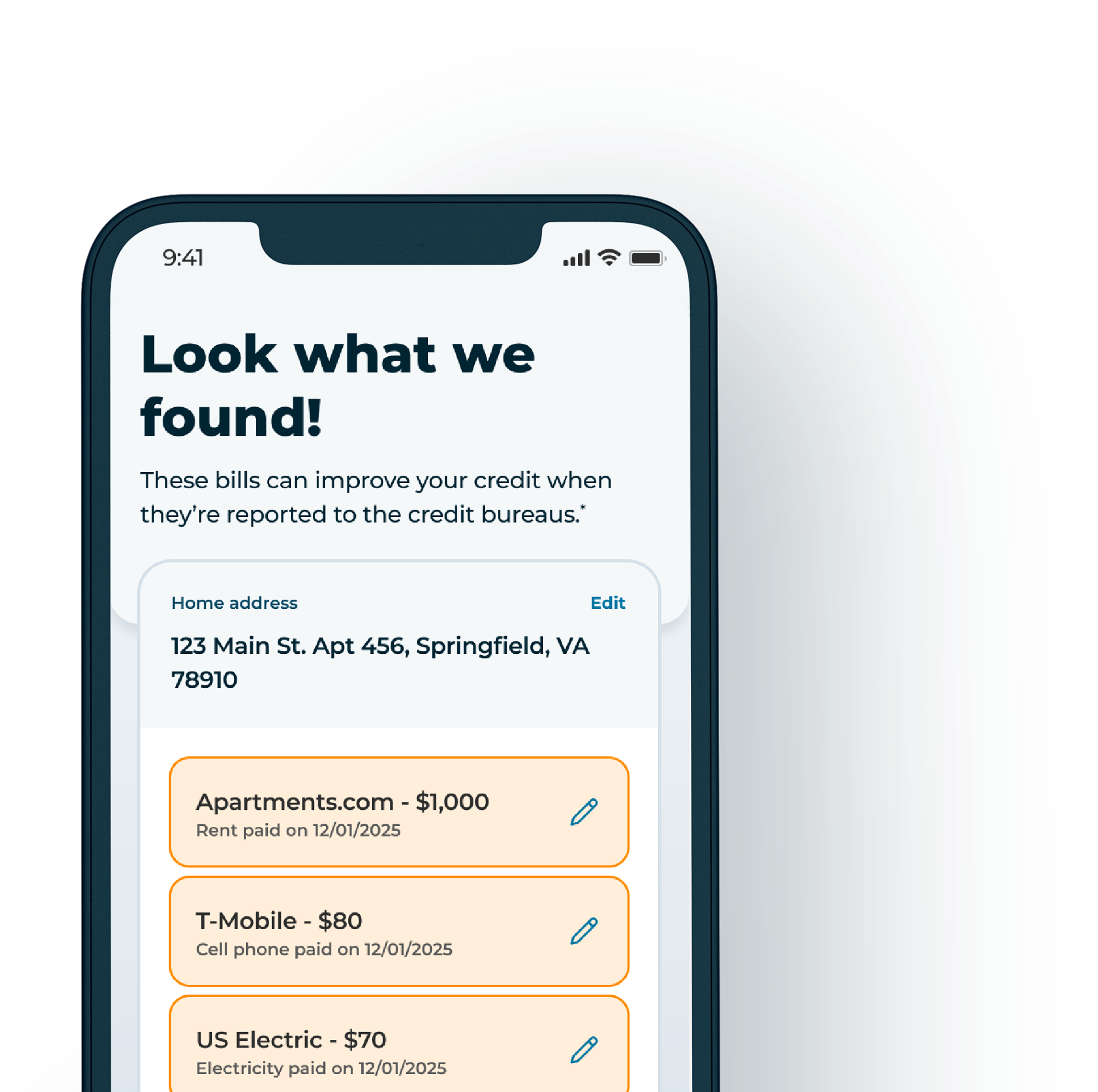 Rent and Bills Reporting adds your on-time rent and bill payments to your credit history. Because payment history makes up 40% of your VantageScore® credit score, these positive payments can strengthen your credit over time.